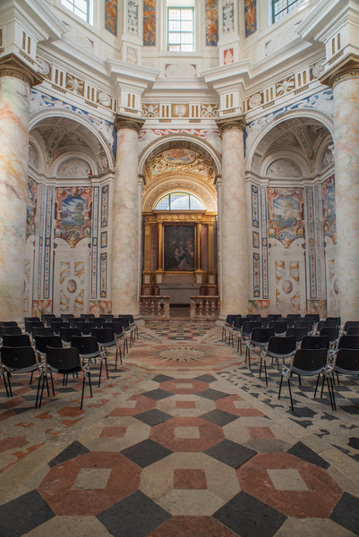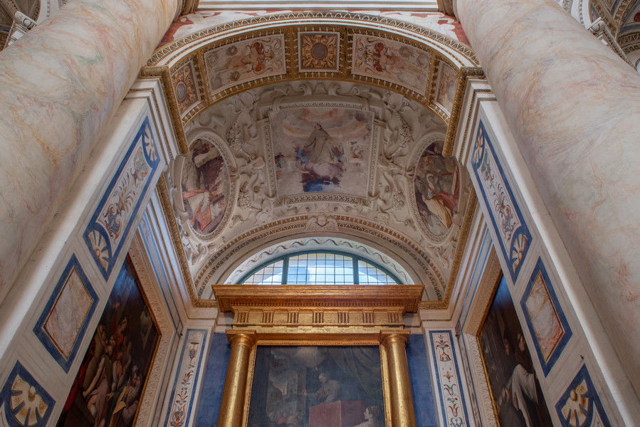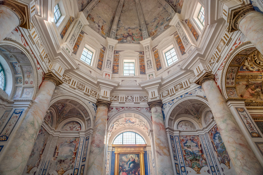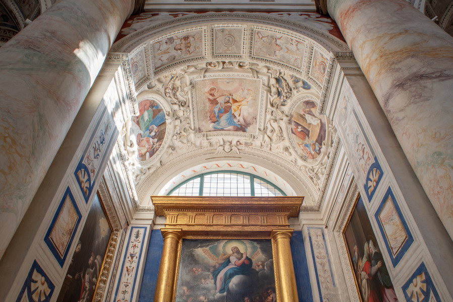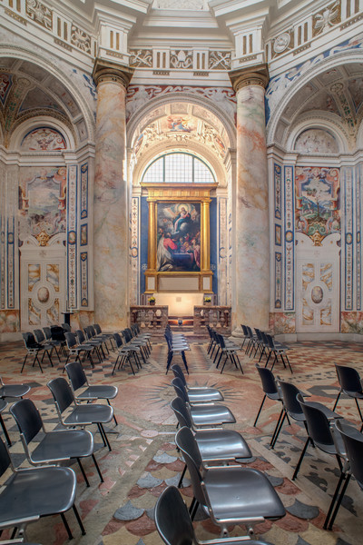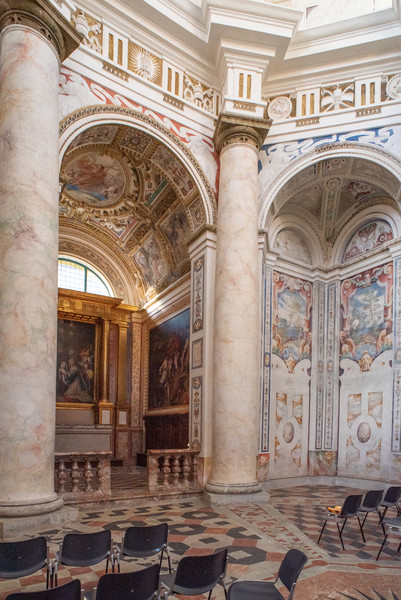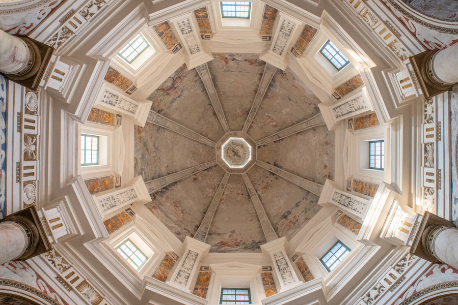 The rapidity of construction and the involvement of master artists in the decoration made it an almost unique case in the area: the architectural layout and iconographic program, all centred on the theme of the Cross and with inventive freedom for the artists, came together in a whole of absolute coherence. The direction of works was probably in collaboration between architect Piotti and painter Camillo Procaccini. Paintings and stuccos merge in a choral vision, drawing on a mannerist and mostly profane figurative repertoire, featuring lion protomes, masks, sphinxes, birds, landscapes and coats of arms(Fig. 7, 8).